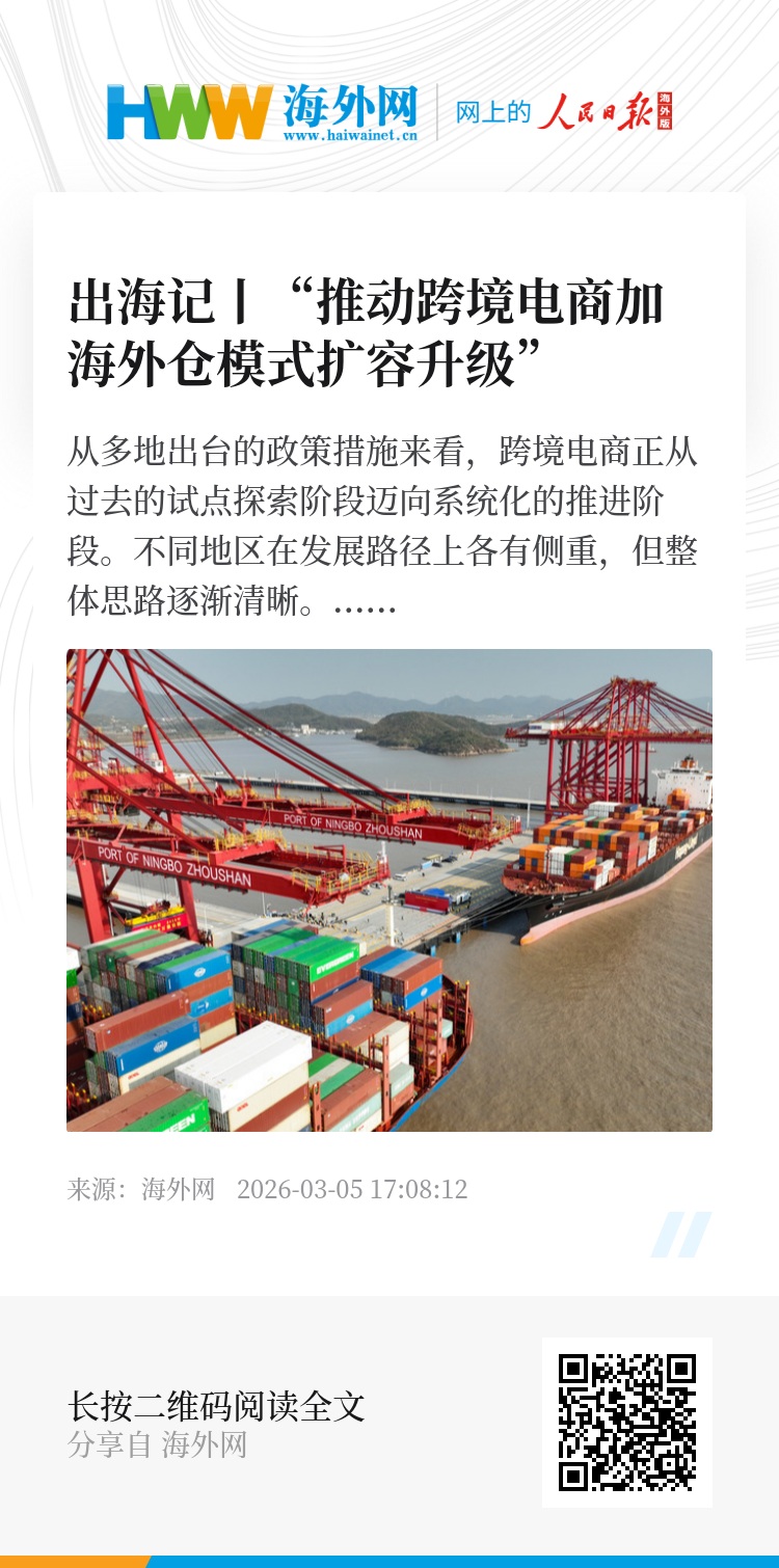 今年政府工作报告提出,培育壮大贸易发展新动能,推动跨境电商加海外仓模式扩容升级、规范有序发展,加强国际寄递物流体系建设,拓展中间品贸易,发展数字贸易、绿色贸易,提升边境贸易。鼓励支持服务出口。积极扩大进口,推进贸易平衡发展。提高跨境贸易便利化水平。