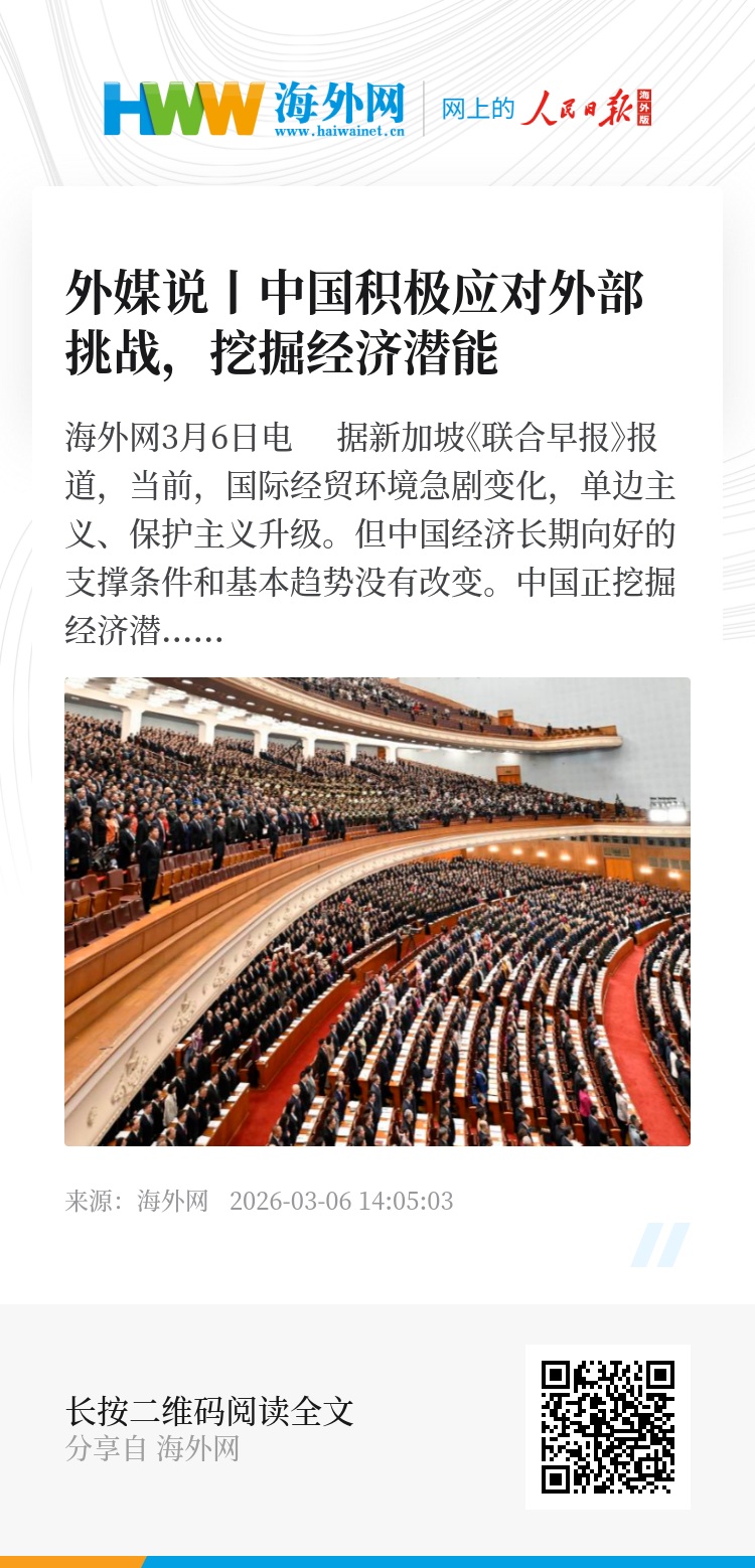 海外网3月6日电 据新加坡《联合早报》报道,当前,国际经贸环境急剧变化,单边主义、保护主义升级。但中国经济长期向好的支撑条件和基本趋势没有改变。中国正挖掘经济潜能,积极应对外部挑战,推动高质量发展。(海外网 王贝思)