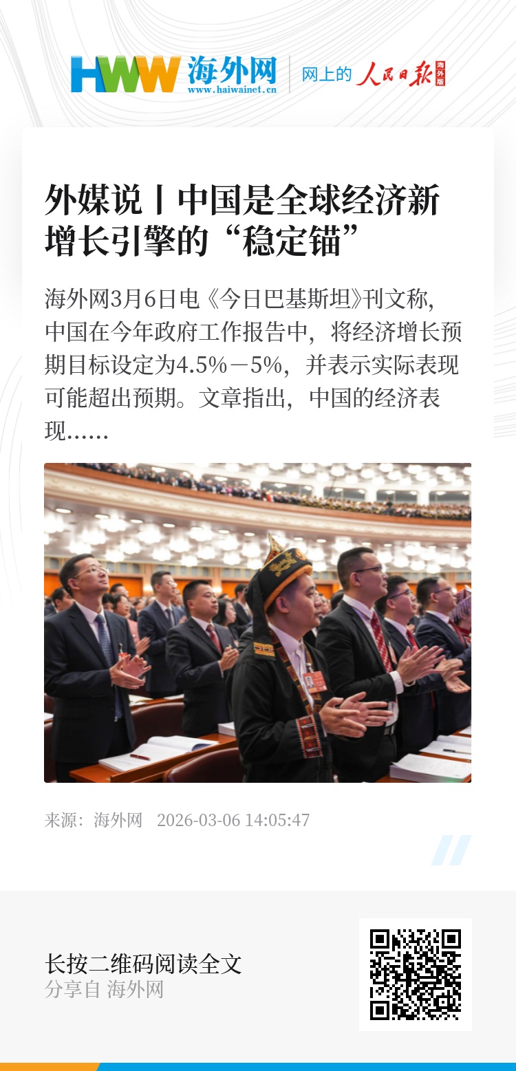 海外网3月6日电 《今日巴基斯坦》刊文称,中国在今年政府工作报告中,将经济增长预期目标设定为4.5%-5%,并表示实际表现可能超出预期。