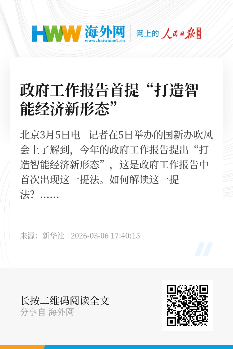 新华社北京3月5日电 记者在5日举办的国新办吹风会上了解到,今年的政府工作报告提出“打造智能经济新形态”,这是政府工作报告中首次出现这一提法。