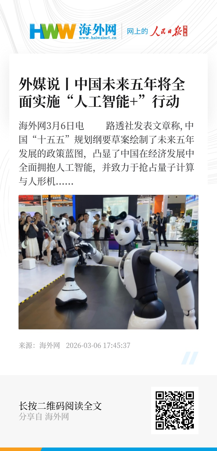文章指出,“十五五”规划纲要草案多次提及人工智能,提出将全面实施“人工智能+”行动。中国对科技的高度关注,既源于发展的迫切需求,也得益于本土AI模型取得突破性进展。一名研究员表示:“中国的目标是利用人工智能和机器人技术,进一步提升制造业、物流业、教育和医疗保健等领域的生产力。”(海外网 李芳)
