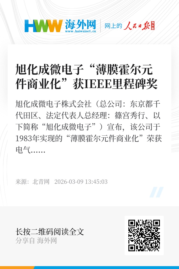 旭化成微电子株式会社(总公司:东京都千代田区、法定代表人总经理:篠宫秀行、以下简称“旭化成微电子”)宣布,该公司于1983年实现的“薄膜霍尔元件商业化”荣获电气电子工程师学会(Institute of Electrical and Electronics Engineers、总部位于美国新泽西州、以下简称“IEEE”)授予的IEEE里程碑奖,详情如下。