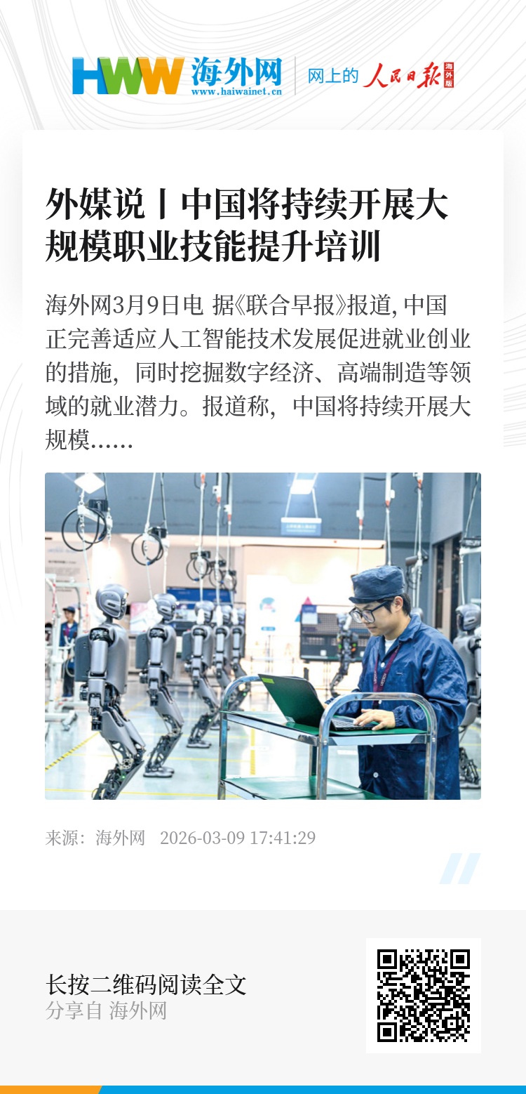 海外网3月9日电 据《联合早报》报道,中国正完善适应人工智能技术发展促进就业创业的措施,同时挖掘数字经济、高端制造等领域的就业潜力。报道称,中国将持续开展大规模职业技能提升培训。此外,中国还将实施稳岗扩容提质行动,支持劳动密集型行业企业稳定岗位,围绕新兴产业、未来产业等培育新职业新岗位,推动技术进步与民生改善相协调的包容性发展。(石雯欣)