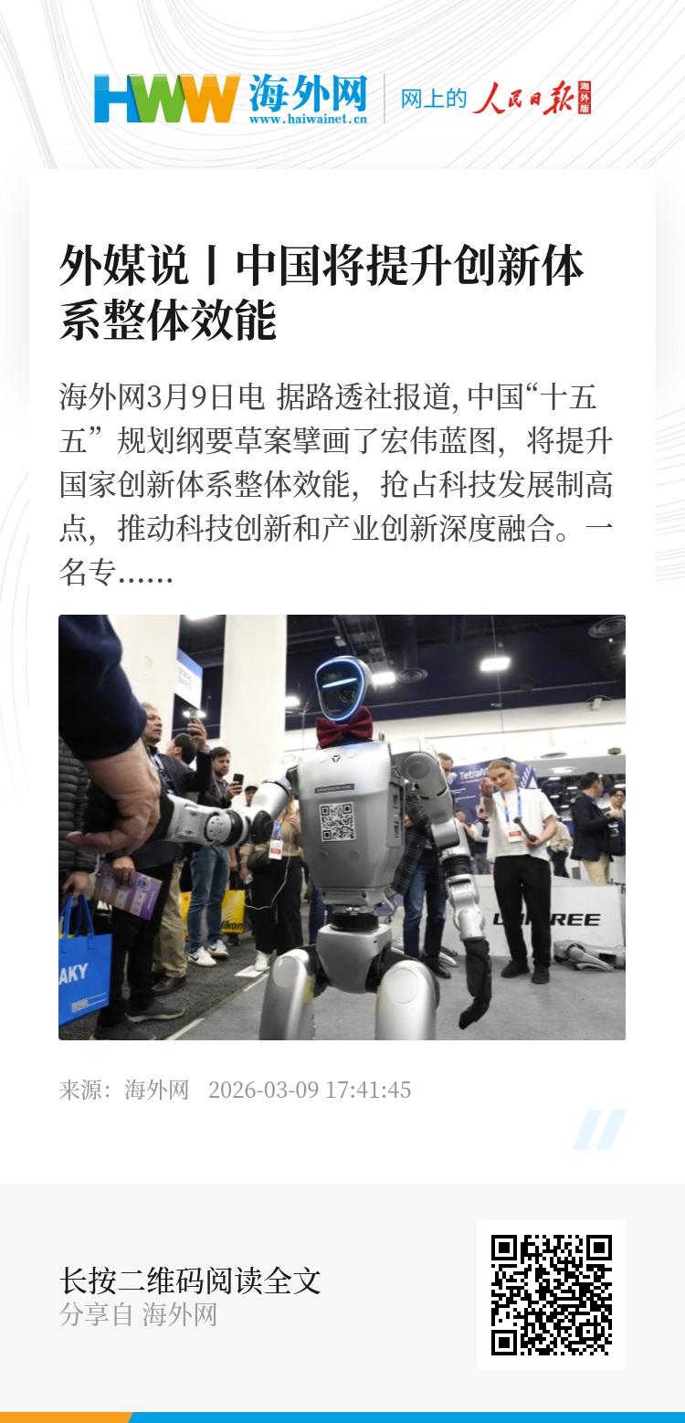 海外网3月9日电 据路透社报道,中国“十五五”规划纲要草案擘画了宏伟蓝图,将提升国家创新体系整体效能,抢占科技发展制高点,推动科技创新和产业创新深度融合。