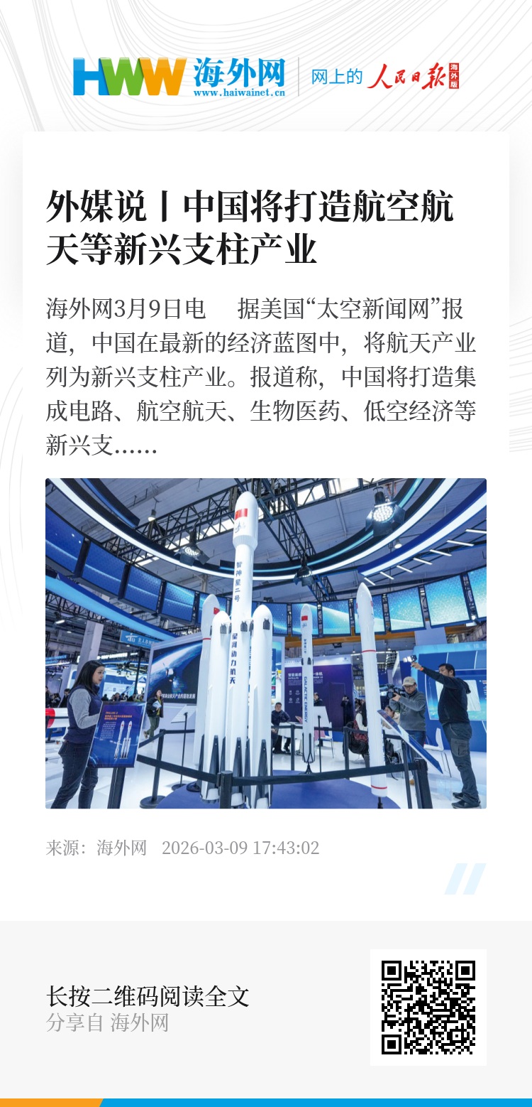 海外网3月9日电 据美国“太空新闻网”报道,中国在最新的经济蓝图中,将航天产业列为新兴支柱产业。