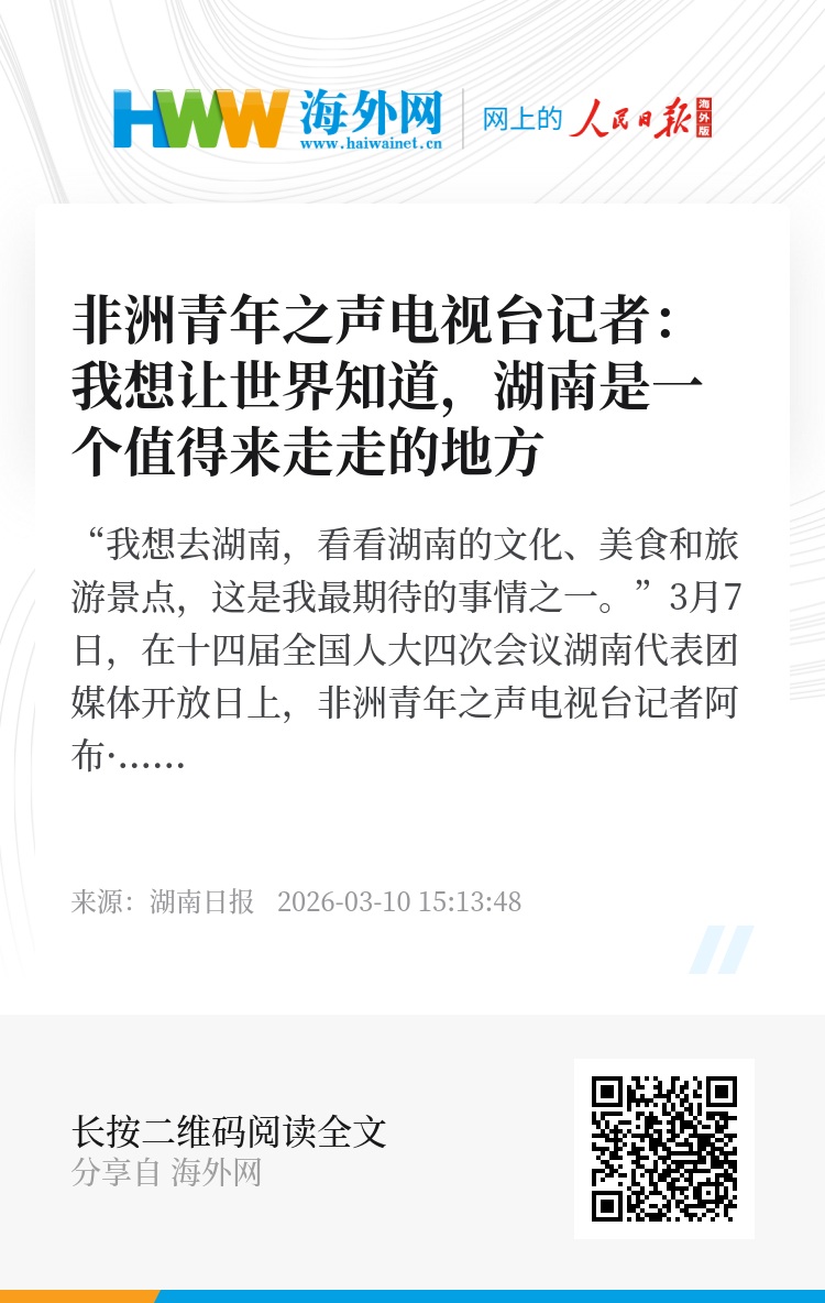 “我想去湖南,看看湖南的文化、美食和旅游景点,这是我最期待的事情之一。”3月7日,在十四届全国人大四次会议湖南代表团媒体开放日上,非洲青年之声电视台记者阿布·巴卡尔充满期待。