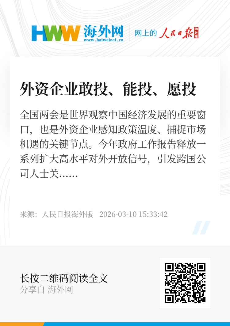 全国两会是世界观察中国经济发展的重要窗口,也是外资企业感知政策温度、捕捉市场机遇的关键节点。今年政府工作报告释放一系列扩大高水平对外开放信号,引发跨国公司人士关注。他们在接受本报记者采访时表示,在全球经济面临不确定性的当下,中国以自身的稳定性和政策的可预期性,为跨国企业提供了宝贵的发展确定性。“十五五”开局之年,跨国企业将继续与中国市场共同成长,书写合作共赢新篇章。