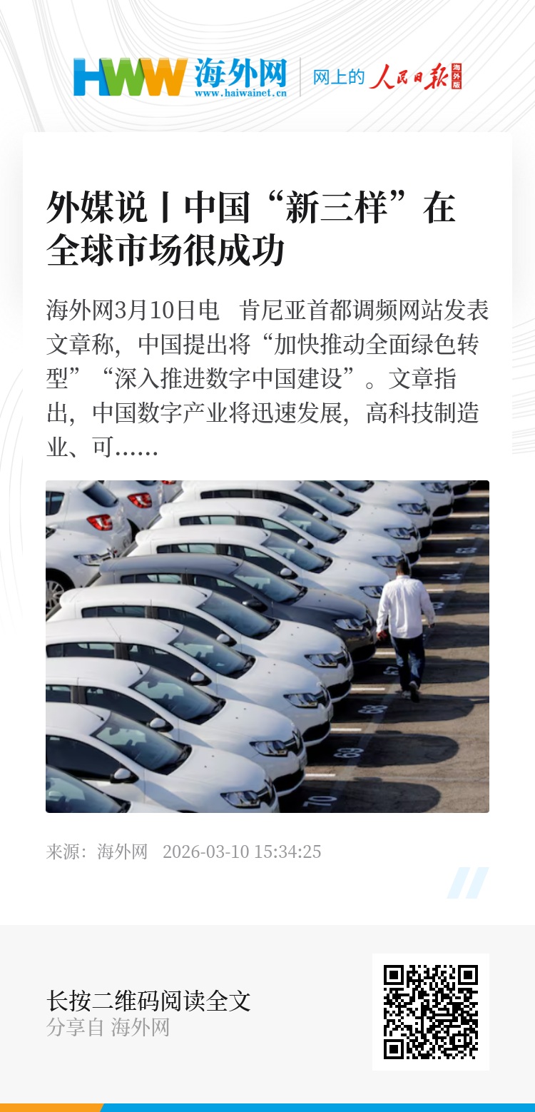 海外网3月10日电 肯尼亚首都调频网站发表文章称,中国提出将“加快推动全面绿色转型”“深入推进数字中国建设”。