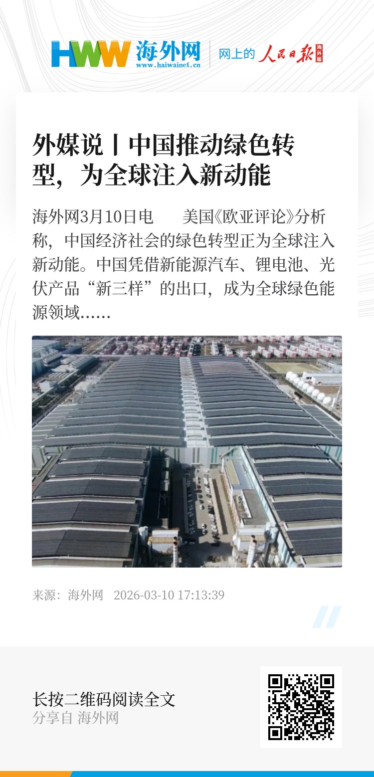 海外网3月10日电 美国《欧亚评论》分析称,中国经济社会的绿色转型正为全球注入新动能。中国凭借新能源汽车、锂电池、光伏产品“新三样”的出口,成为全球绿色能源领域的关键合作伙伴。外媒认为,通过高质量共建“一带一路”,中国将其在可再生能源领域的领先地位,转化为全球绿色转型的动力源。(海外网 王贝思)