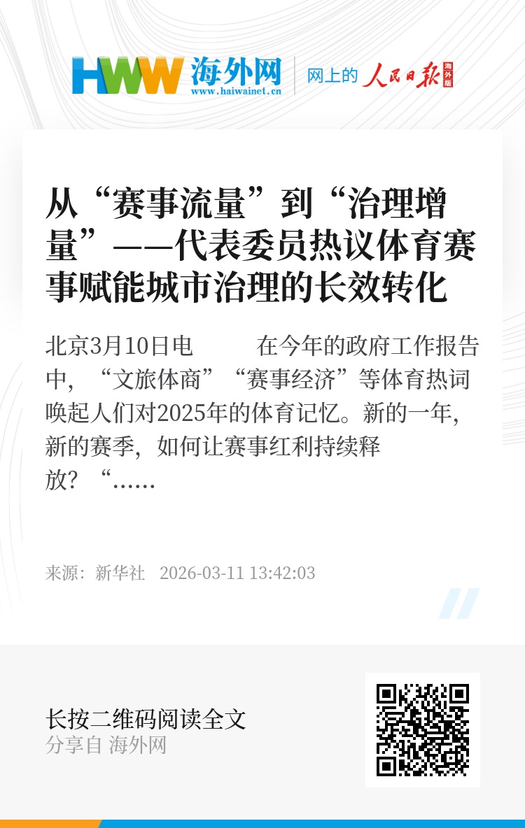 新华社北京3月10日电 在今年的政府工作报告中,“文旅体商”“赛事经济”等体育热词唤起人们对2025年的体育记忆。新的一年,新的赛季,如何让赛事红利持续释放?“积极发展赛事经济、冰雪经济、户外运动,建好用好群众身边的运动场地设施,培育更多特色群众体育赛事活动”成为2026年的一项重要工作任务。