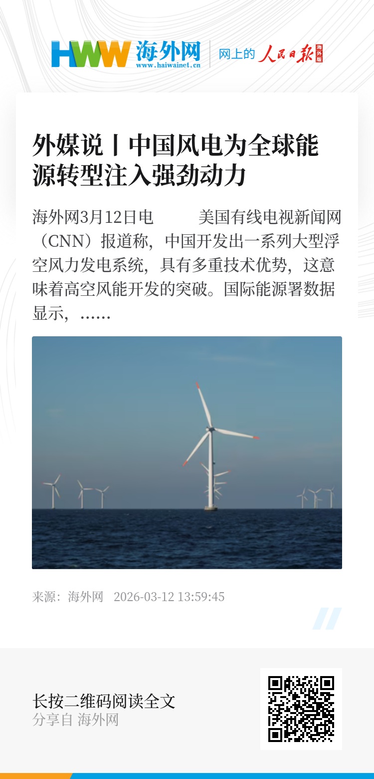 海外网3月12日电 美国有线电视新闻网(CNN)报道称,中国开发出一系列大型浮空风力发电系统,具有多重技术优势,这意味着高空风能开发的突破。