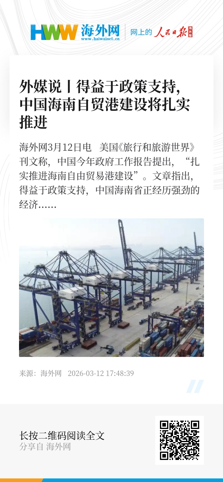 海外网3月12日电 美国《旅行和旅游世界》刊文称,中国今年政府工作报告提出,“扎实推进海南自由贸易港建设”。