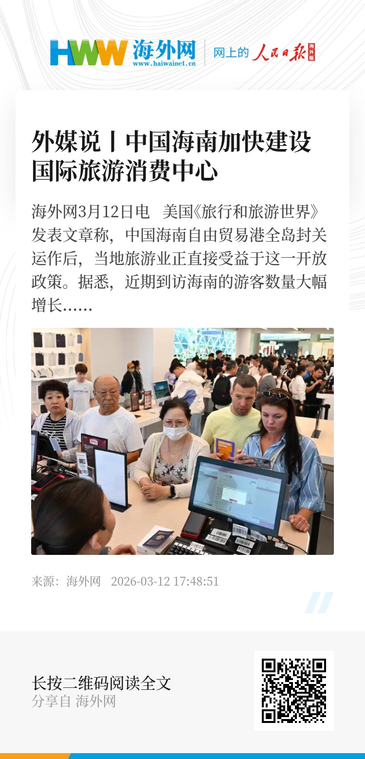 海外网3月12日电 美国《旅行和旅游世界》发表文章称,中国海南自由贸易港全岛封关运作后,当地旅游业正直接受益于这一开放政策。据悉,近期到访海南的游客数量大幅增长,这是海南加快建设国际旅游消费中心的直接结果,“零关税”政策以及改善旅游基础设施的举措在吸引游客方面发挥了核心作用。