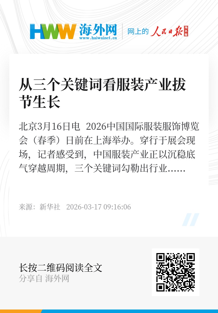新华社北京3月16日电 2026中国国际服装服饰博览会(春季)日前在上海举办。穿行于展会现场,记者感受到,中国服装产业正以沉稳底气穿越周期,三个关键词勾勒出行业在变局中稳扎稳打、笃定生长的坚实轨迹。