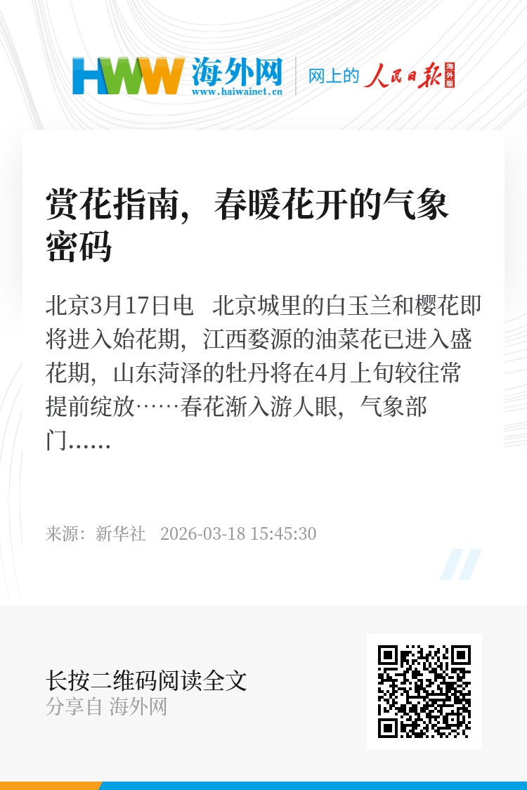 新华社北京3月17日电 北京城里的白玉兰和樱花即将进入始花期,江西婺源的油菜花已进入盛花期,山东菏泽的牡丹将在4月上旬较往常提前绽放……春花渐入游人眼,气象部门识读花语、预测花期,揭示花开密码,为人们踏青赏花提供参考。
