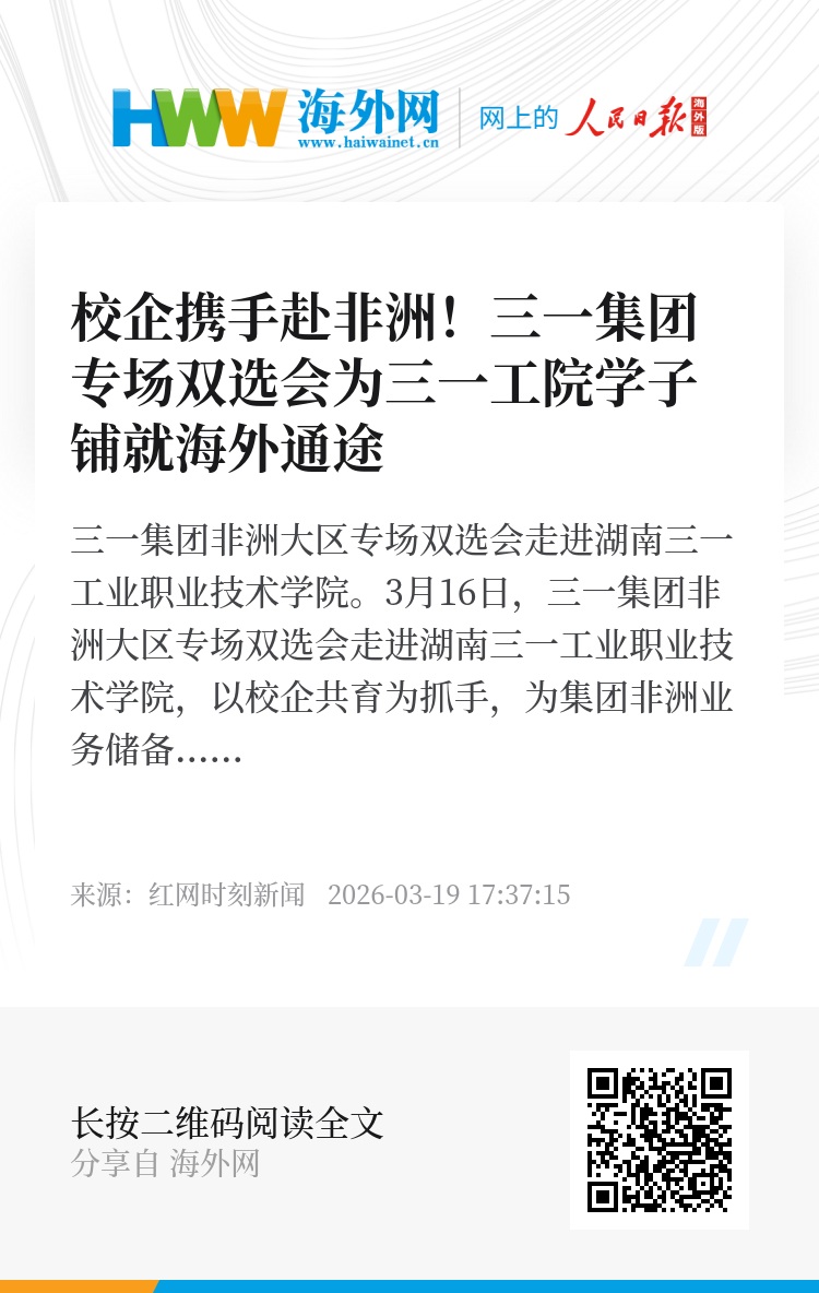 此次专场双选会的成功举办,既是对学校人才培养质量的充分肯定,也是校企深化合作、共育海外复合型技术技能人才的重要实践。未来,湖南三一工业职业技术学院将继续深耕产教融合,聚焦职教出海,不断优化国际人才培养体系,拓展海外人才输送渠道,为推动湖南职业教育高质量对外开放、助力中资企业“走出去”、服务“一带一路”建设和中非友好合作贡献职教力量。(红网时刻新闻通讯员 谭李岚君 高妍)