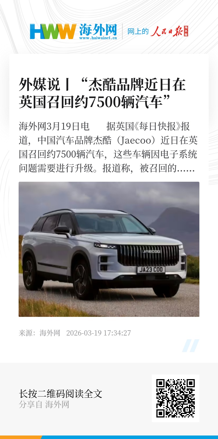 海外网3月19日电 据英国《每日快报》报道,中国汽车品牌杰酷(Jaecoo)近日在英国召回约7500辆汽车,这些车辆因电子系统问题需要进行升级。