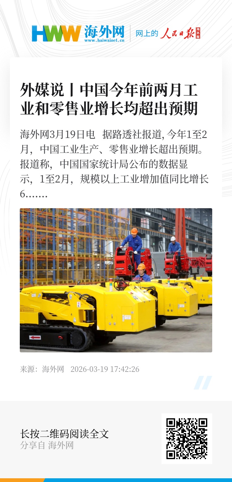海外网3月19日电 据路透社报道,今年1至2月,中国工业生产、零售业增长超出预期。