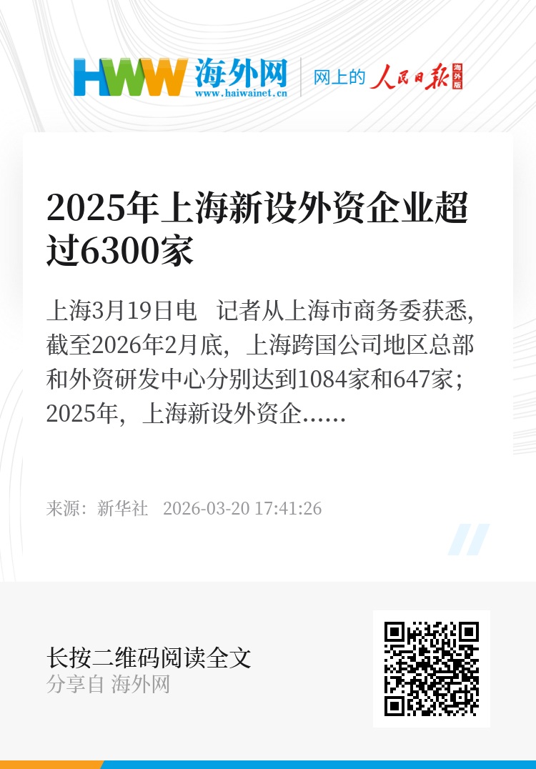 新华社上海3月19日电 记者从上海市商务委获悉,截至2026年2月底,上海跨国公司地区总部和外资研发中心分别达到1084家和647家;2025年,上海新设外资企业超过6300家,同比增长6.8%。