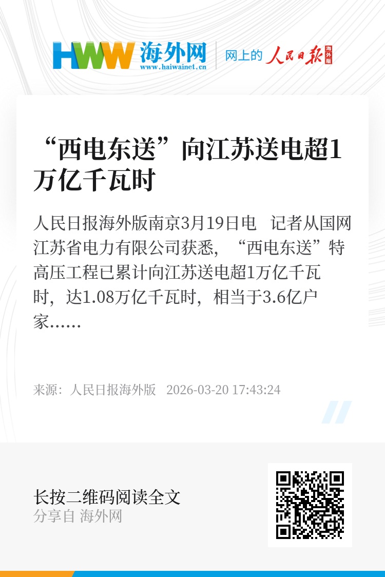 人民日报海外版南京3月19日电 记者从国网江苏省电力有限公司获悉,“西电东送”特高压工程已累计向江苏送电超1万亿千瓦时,达1.08万亿千瓦时,相当于3.6亿户家庭一年的用电量。