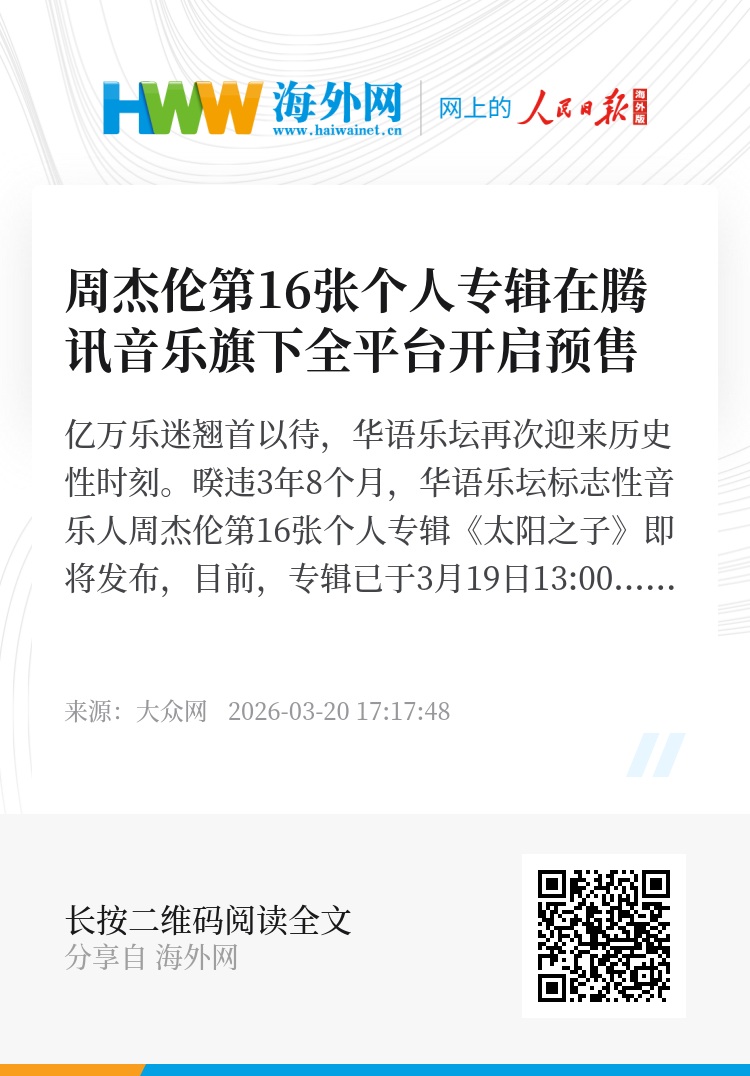 暌违3年8个月,华语乐坛标志性音乐人周杰伦第16张个人专辑《太阳之子》即将发布,目前,专辑已于3月19日13:00在腾讯音乐娱乐集团旗下QQ音乐、酷狗音乐、酷我音乐三大平台率先开启预售。