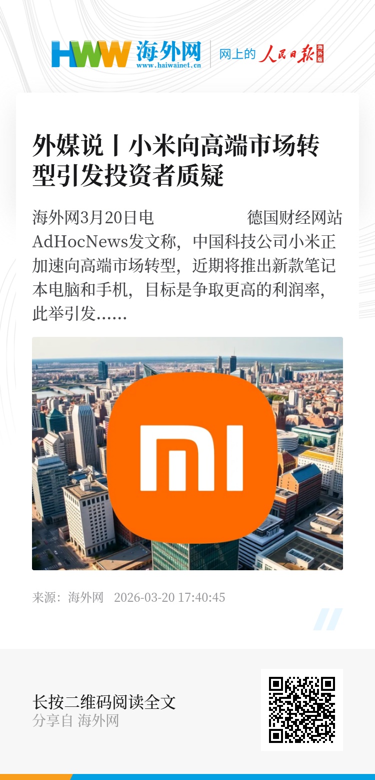 海外网3月20日电 德国财经网站AdHocNews发文称,中国科技公司小米正加速向高端市场转型,近期将推出新款笔记本电脑和手机,目标是争取更高的利润率,此举引发投资者的质疑。