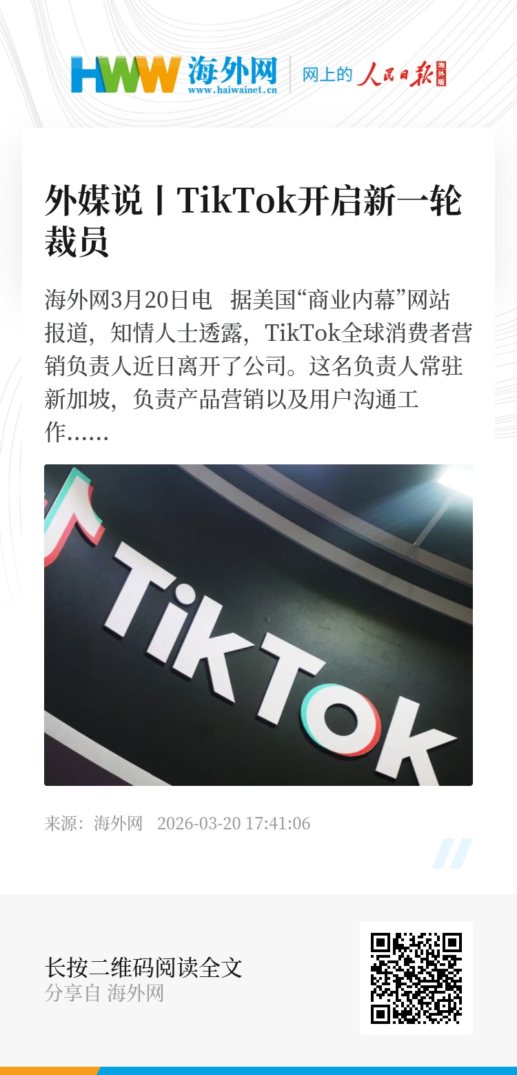 海外网3月20日电 据美国“商业内幕”网站报道,知情人士透露,TikTok全球消费者营销负责人近日离开了公司。这名负责人常驻新加坡,负责产品营销以及用户沟通工作。