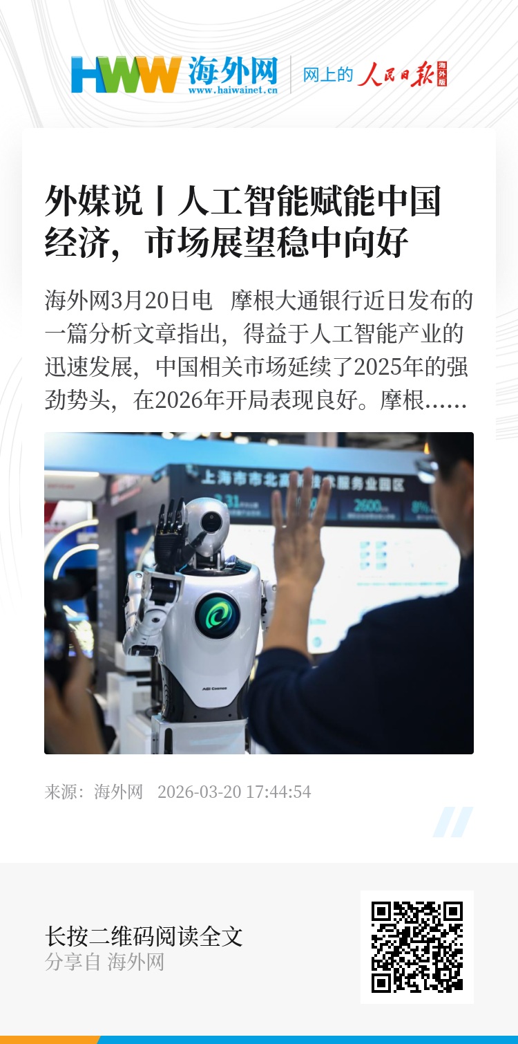 海外网3月20日电 摩根大通银行近日发布的一篇分析文章指出,得益于人工智能产业的迅速发展,中国相关市场延续了2025年的强劲势头,在2026年开局表现良好。摩根大通银行上调了对中国市场的展望,预测2026年中国整体经济将以稳中向好的态势前进,同时,人工智能等科技产业的飞速发展,也将为中国市场带来更多机遇。