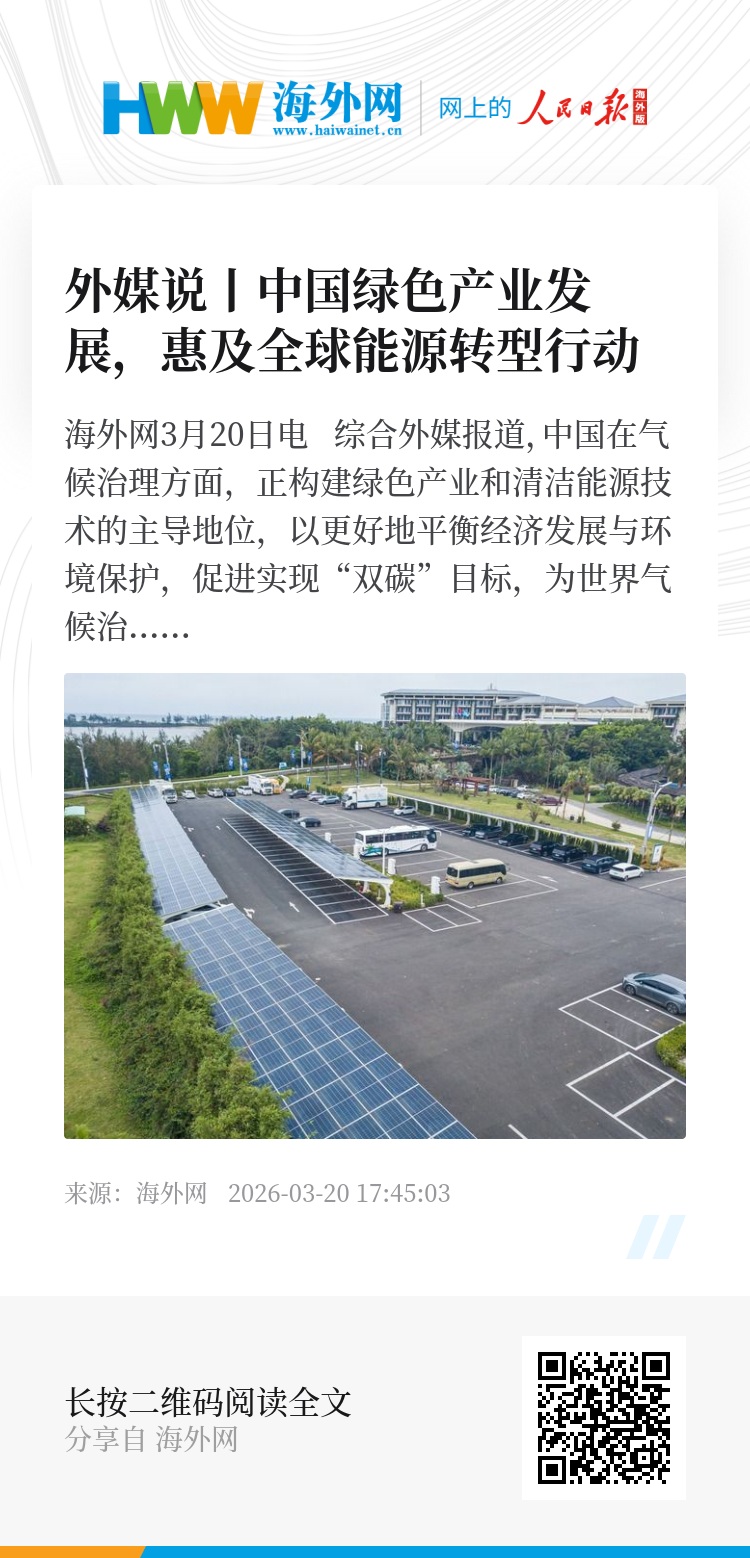 海外网3月20日电 综合外媒报道,中国在气候治理方面,正构建绿色产业和清洁能源技术的主导地位,以更好地平衡经济发展与环境保护,促进实现“双碳”目标,为世界气候治理提供中国智慧、中国方案。