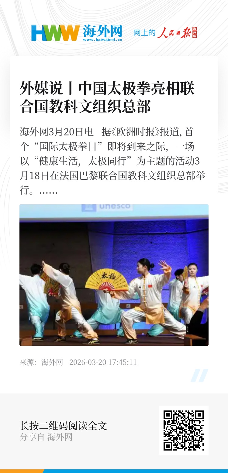 海外网3月20日电 据《欧洲时报》报道,首个“国际太极拳日”即将到来之际,一场以“健康生活,太极同行”为主题的活动3月18日在法国巴黎联合国教科文组织总部举行。来自俄罗斯、哥伦比亚、哈萨克斯坦、塞内加尔等十余个国家的常驻团代表、联合国教科文组织官员以及太极拳爱好者等400余人参加,推动文化互鉴与民心相通。活动现场,来自中法两国的太极拳习练者同台献艺,联袂呈现太极拳的独特魅力与深厚内涵,向世界传播中华优秀传统文化和科学健康的生活方式。