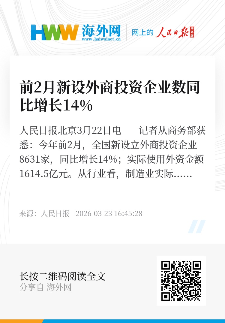 人民日报北京3月22日电 记者从商务部获悉:今年前2月,全国新设立外商投资企业8631家,同比增长14%;实际使用外资金额1614.5亿元。