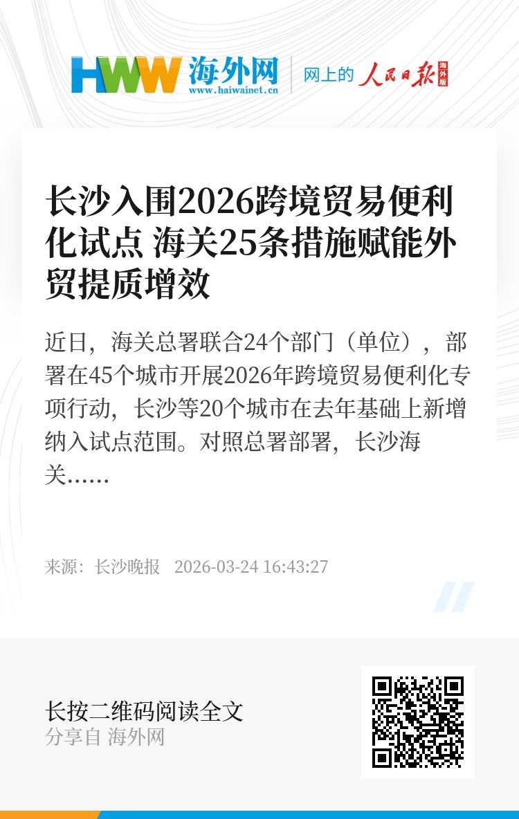 近日,海关总署联合24个部门(单位),部署在45个城市开展2026年跨境贸易便利化专项行动,长沙等20个城市在去年基础上新增纳入试点范围。