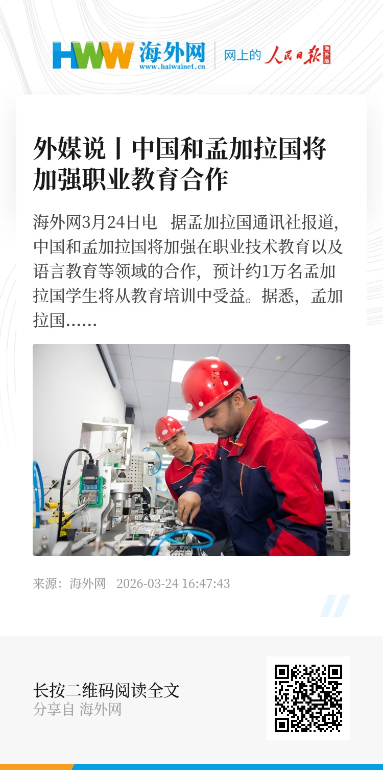 海外网3月24日电 据孟加拉国通讯社报道,中国和孟加拉国将加强在职业技术教育以及语言教育等领域的合作,预计约1万名孟加拉国学生将从教育培训中受益。