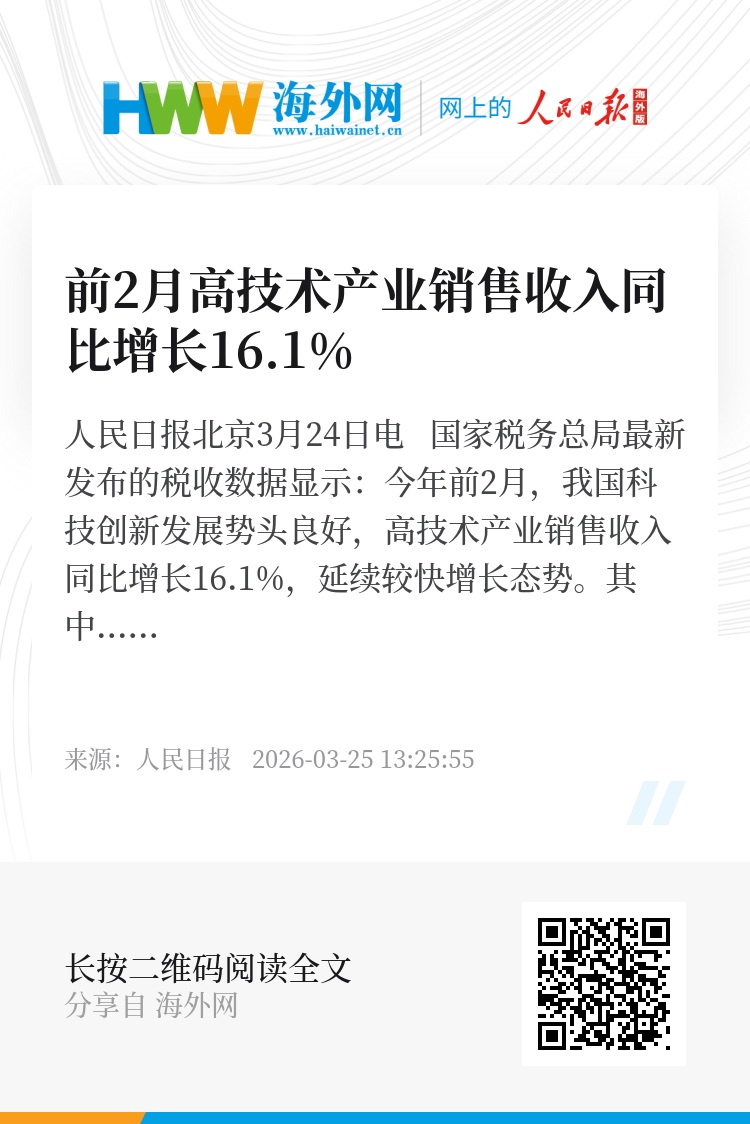 人民日报北京3月24日电 国家税务总局最新发布的税收数据显示:今年前2月,我国科技创新发展势头良好,高技术产业销售收入同比增长16.1%,延续较快增长态势。