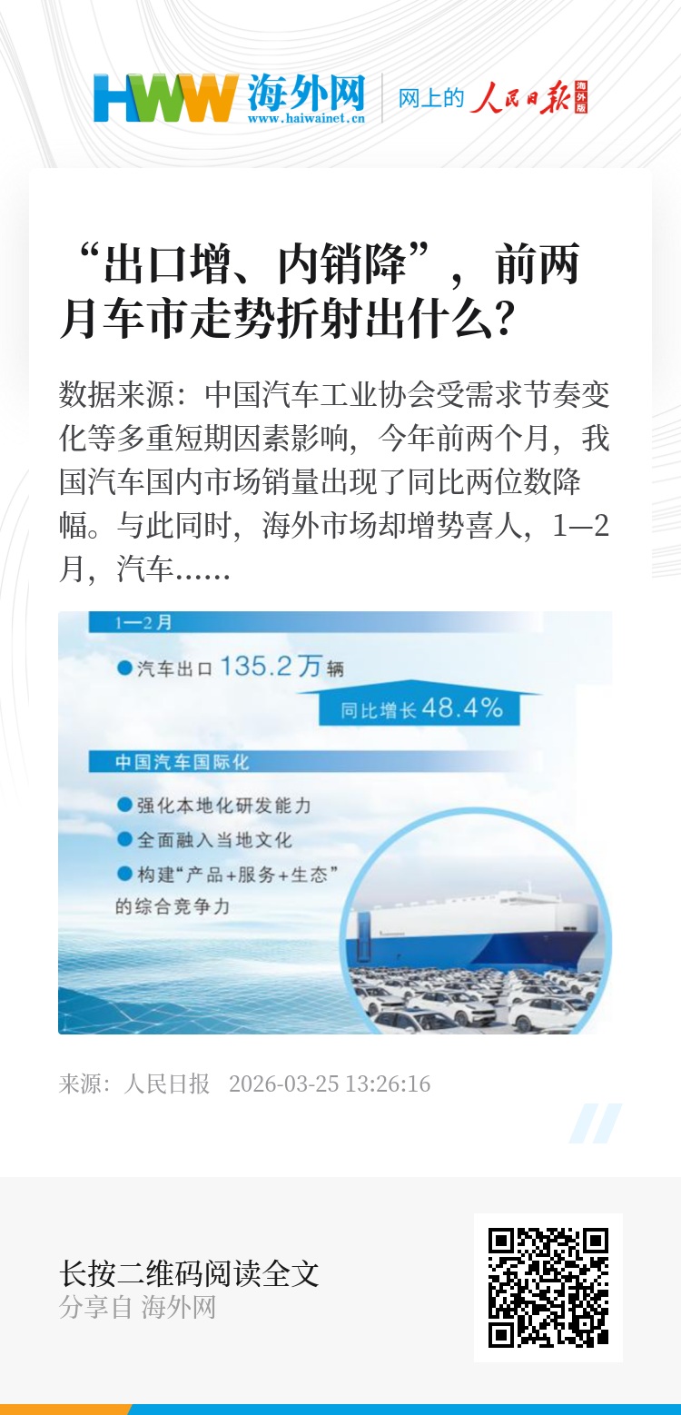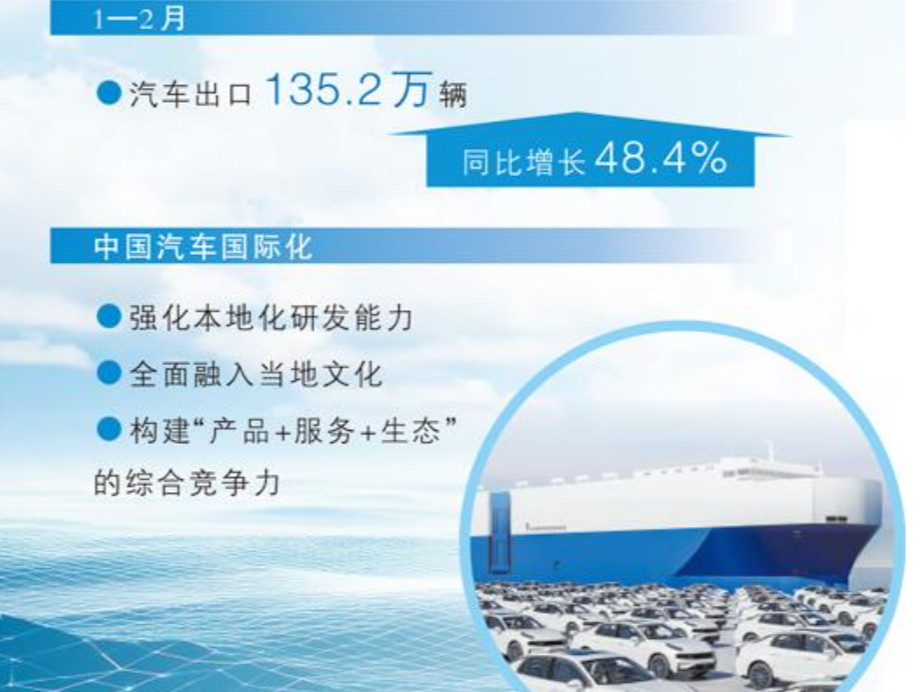受需求节奏变化等多重短期因素影响,今年前两个月,我国汽车国内市场销量出现了同比两位数降幅。与此同时,海外市场却增势喜人,1—2月,汽车出口135.2万辆,同比增长48.4%,成为对冲国内市场波动的重要力量。