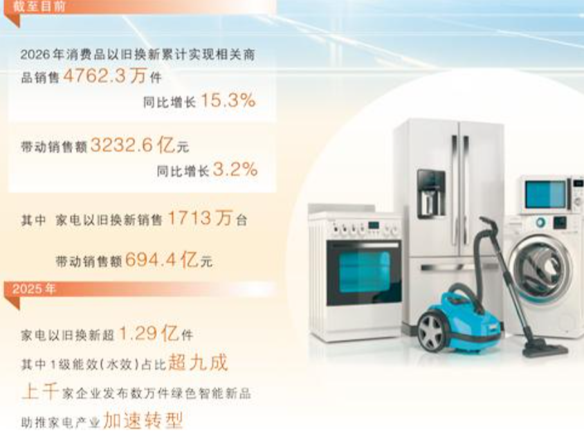 家电市场刮起的“绿色”新风,背后是政策的引导助力。2024年家电以旧换新启动,提出“对购买1级及以上能效或水效的产品,额外再给予产品最终销售价格5%的补贴”;2026年以旧换新“国补”继续,家电补贴明确指向“1级能效或水效”。