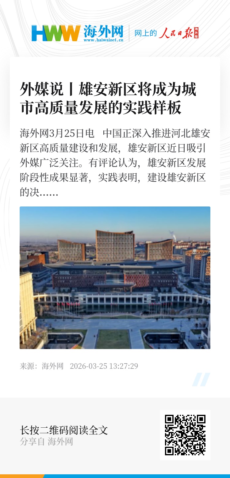 海外网3月25日电 中国正深入推进河北雄安新区高质量建设和发展,雄安新区近日吸引外媒广泛关注。有评论认为,雄安新区发展阶段性成果显著,实践表明,建设雄安新区的决定毋庸置疑。通过系统谋划和创新驱动,雄安积极探索面向未来的智慧城市管理模式,将成为城市高质量发展的实践样板。