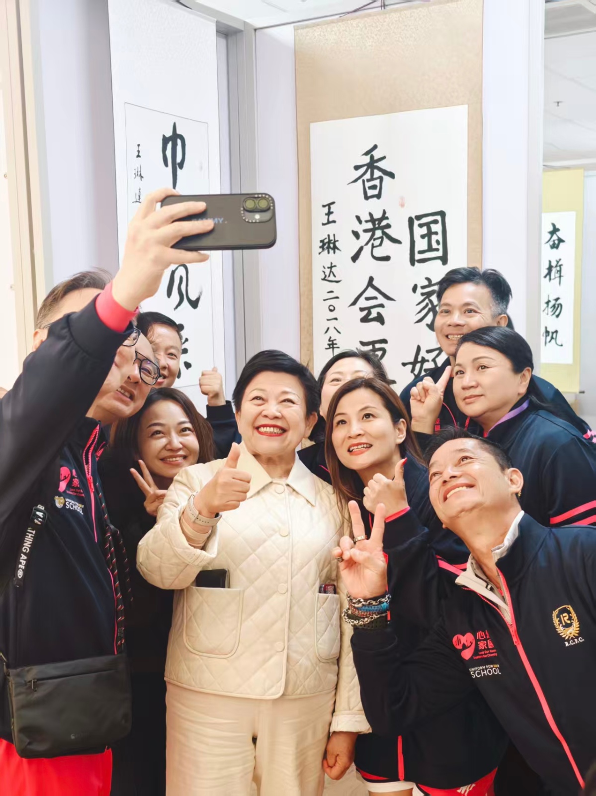 怡海教育集团创办人王琳达和香港交流团在“国家好,香港会更好”书法前合影 海外网 陈伟栋 摄