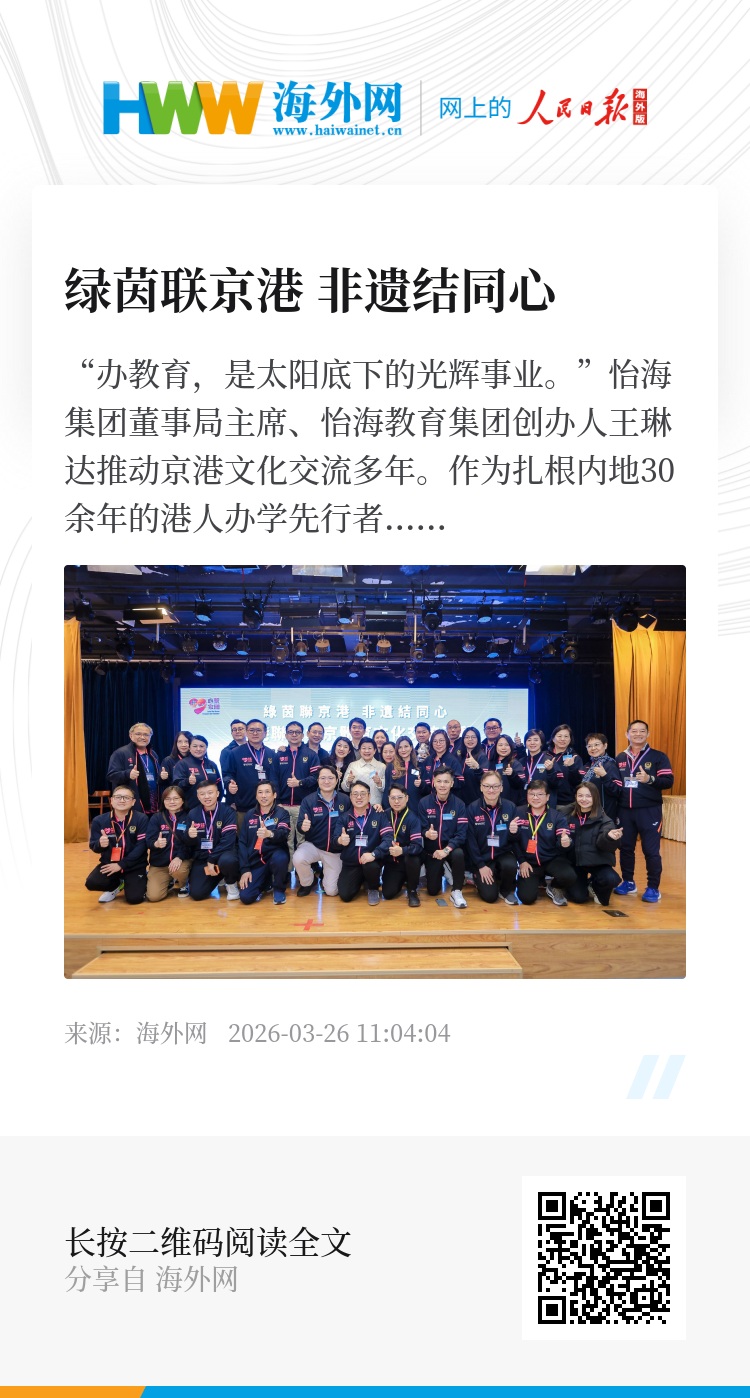 怡海教育集团理事长王乐茵向人民日报海外网表示,“非遗进校园”课程已走进香港50多所学校,惠及近4000名学生。她认为文化认同从来不是靠课堂说教,而是让孩子们亲手触摸、亲身感受。怡海始终将非遗文化融入日常教学,就是希望以文化为纽带,让两地青少年筑牢共同的文化根脉。
