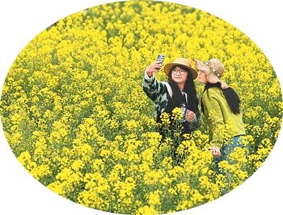 游客在四川省南充市蓬安县睦坝镇武胜村油菜花田里赏花游玩。