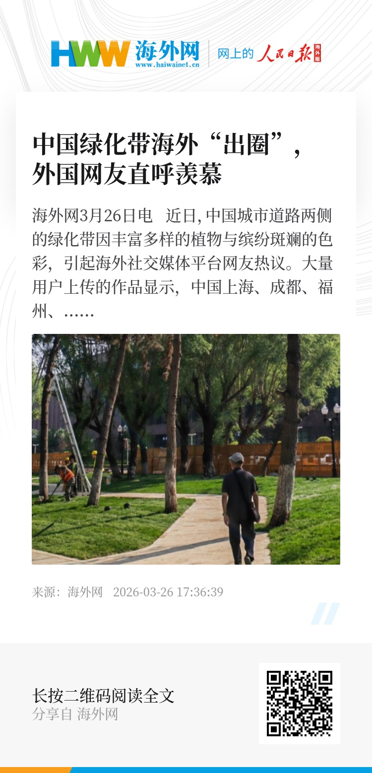海外网3月26日电 近日,中国城市道路两侧的绿化带因丰富多样的植物与缤纷斑斓的色彩,引起海外社交媒体平台网友热议。大量用户上传的作品显示,中国上海、成都、福州、南宁、郑州等多地的绿化带“卷”成“花海园林”,呈现出鲜明的视觉层次与景观效果。海外网友纷纷惊呼“这座城市看起来像一幅风景画”“中国真的有人间天堂吗”“等不及想要自驾去体验了”。有评论认为,将生态功能与城市美学相融合的公共空间营造方式,正是“美丽中国”的生动缩影。(石雯欣)