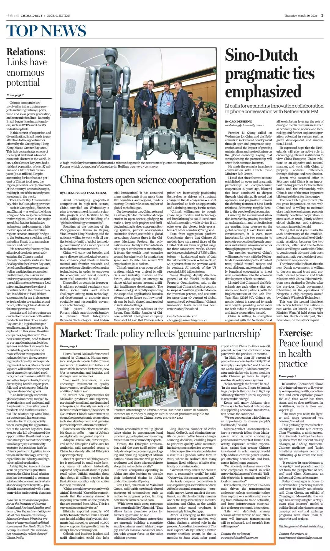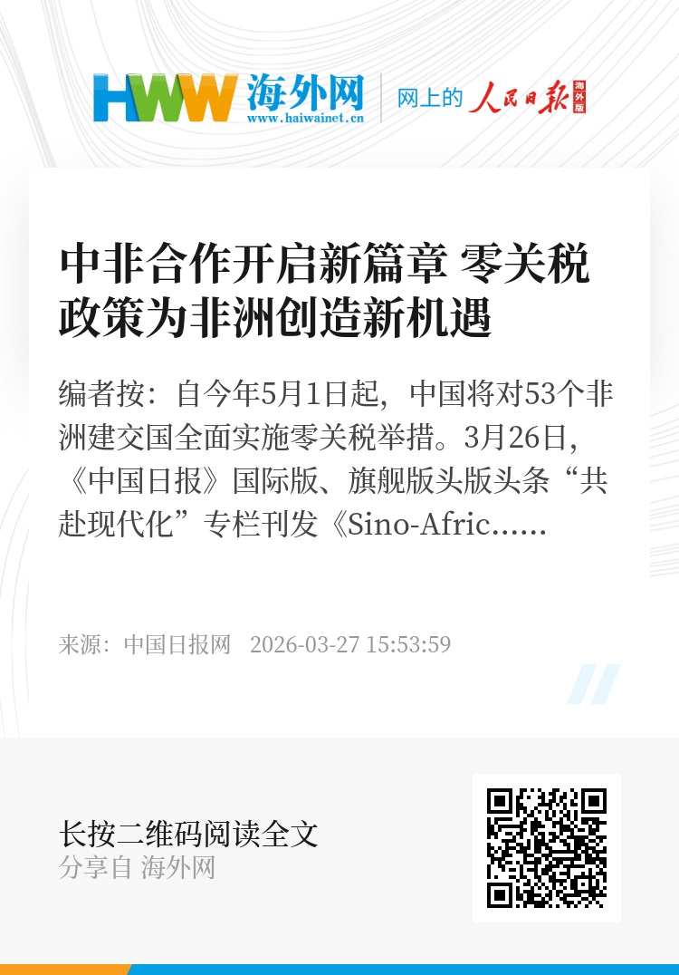 编者按:自今年5月1日起,中国将对53个非洲建交国全面实施零关税举措。3月26日,《中国日报》国际版、旗舰版头版头条“共赴现代化”专栏刊发《Sino-African ties to open new chapter(中非合作开启新篇章 零关税政策为非洲创造新机遇)》。报道聚焦该政策,以湖南推进中非经贸合作实践为鲜活案例,从非洲国家驻华大使到商会代表,从“小咖主”直采助农到美兰集团赋能产业链,湖南以开放姿态让零关税政策红利精准惠及非洲各国,为非洲中小企业和广大农户带来广阔的市场机遇。中非合作正从坦赞铁路的基建互通迈向湘江畔的贸易深耕,为构建中非命运共同体树立了标杆,书写共赴现代化的时代答卷。