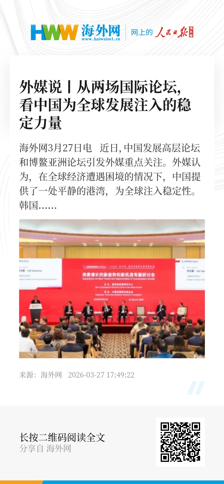 海外网3月27日电 近日,中国发展高层论坛和博鳌亚洲论坛引发外媒重点关注。外媒认为,在全球经济遭遇困境的情况下,中国提供了一处平静的港湾,为全球注入稳定性。