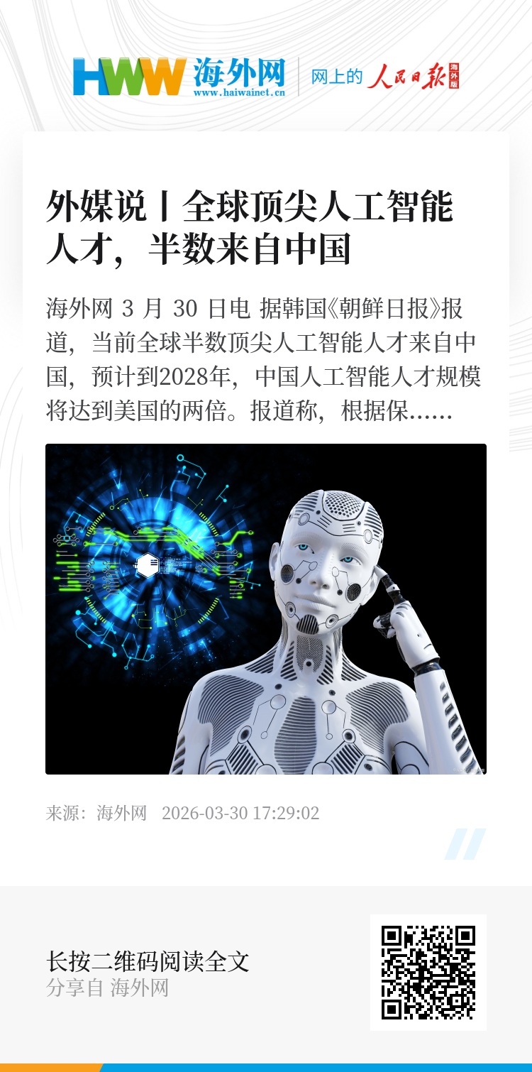 海外网 3 月 30 日电 据韩国《朝鲜日报》报道,当前全球半数顶尖人工智能人才来自中国,预计到2028年,中国人工智能人才规模将达到美国的两倍。