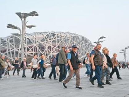 北京通过精准文旅推介和特色文旅产品供给,推动入境游人次与消费增长。图为外国游客近日在北京鸟巢参观游玩。