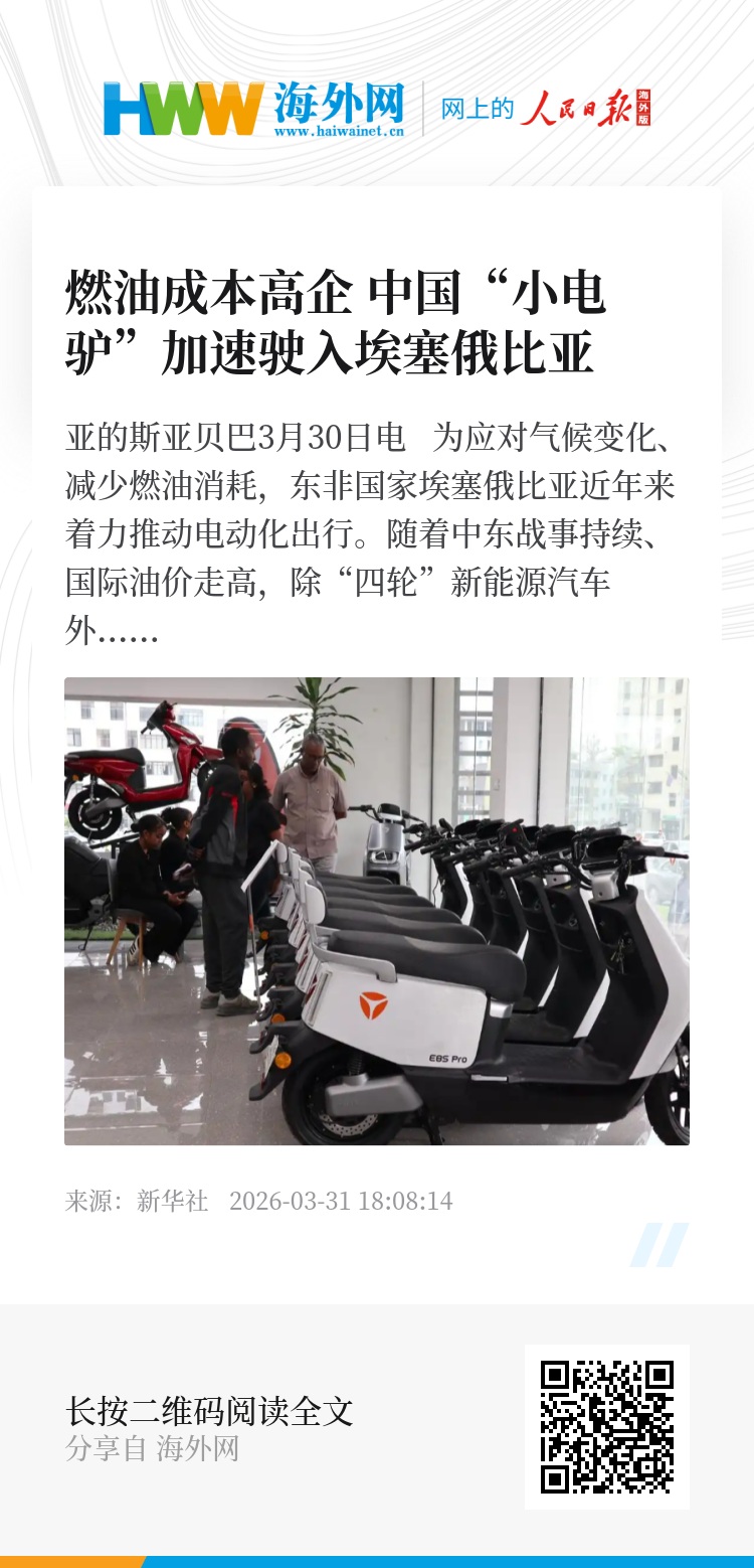 新华社亚的斯亚贝巴3月30日电 为应对气候变化、减少燃油消耗,东非国家埃塞俄比亚近年来着力推动电动化出行。随着中东战事持续、国际油价走高,除“四轮”新能源汽车外,“两轮”电动自行车也在加速驶向东非高原。