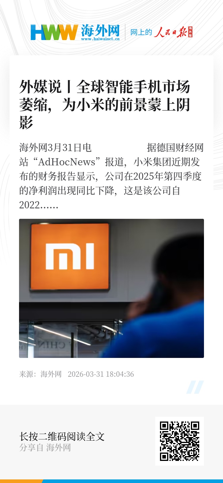 海外网3月31日电 据德国财经网站“AdHocNews”报道,小米集团近期发布的财务报告显示,公司在2025年第四季度的净利润出现同比下降,这是该公司自2022年底以来的首次季度下滑。此外,小米在该季度的收入增长也有所放缓,为2023年以来的最低水平。