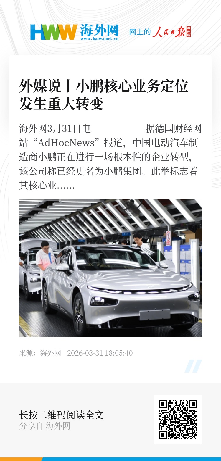 海外网3月31日电 据德国财经网站“AdHocNews”报道,中国电动汽车制造商小鹏正在进行一场根本性的企业转型,该公司称已经更名为小鹏集团。此举标志着其核心业务定位正发生超越汽车制造的重大转变。