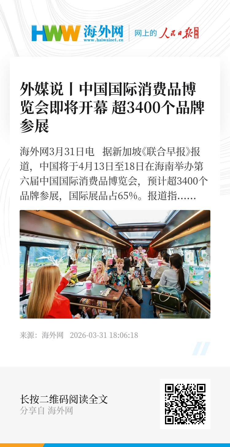 海外网3月31日电 据新加坡《联合早报》报道,中国将于4月13日至18日在海南举办第六届中国国际消费品博览会,预计超3400个品牌参展,国际展品占65%。