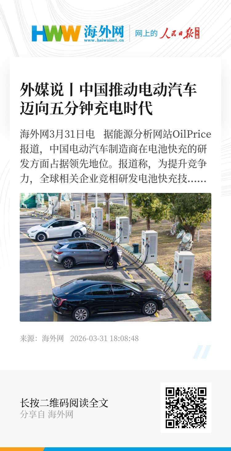 海外网3月31日电 据能源分析网站OilPrice报道,中国电动汽车制造商在电池快充的研发方面占据领先地位。